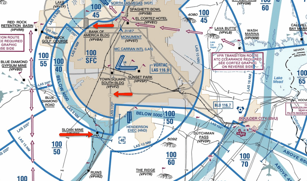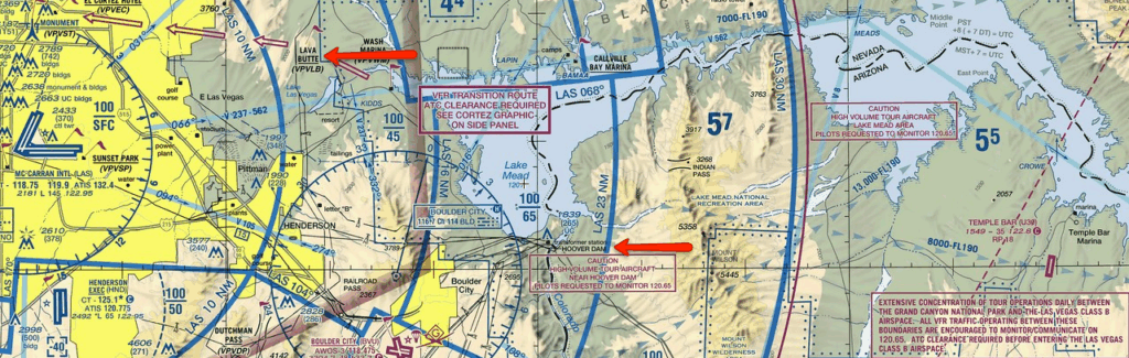 So you’ve won the jackpots, seen the sights, and eaten at the buffet, but now it’s time to think about your trip back out of the valley. Luckily, the transition south is almost identical to the flight in, so go ahead and request the Bravo transition south when you contact KVGT Ground for taxi instructions. KVGT may or MAY NOT coordinate for you, but if not they will give a departure heading, and frequency to contact LAS TRACON to make your request once in the air. Dial this into your second radio if you have one, because you’ll need it soon after rotation. If you are interested in seeing the Hoover Dam and the tallest concrete span arch bridge in the world request an east departure with KVGT tower. You will also want to make this request if you are headed back to the state of Arizona or towards the Blythe (BLH) VOR. You’ll be handed off to Nellis approach upon departure. You can expect to maintain 5000 and expect vectors to pass right over the center of Nellis AFB (KLSV). Inform them that you will cancel over the Gypsum Mine which is just east of KLSV and depicted on the TAC (on the sectional it is depicted as plant and strip mine). Pilots are requested to monitor 120.65 and it is highly suggested. Be alert for high volume tour traffic in the area. Also observe FAA advisory circular (AC) 91-36, which requests 2,000 AGL clearance in noise sensitive areas. Most of the tour companies over the Hoover Dam will approach the dam from the northwest or will approach from the Boulder City substation which is depicted on the TAC chart just southeast of Boulder City Airport (KBVU). They will be helicopters and will be operating at 3500 on the tour. Be alert for fixed wing tour traffic as well departing from KBVU heading east as well as those returning from the Grand Canyon landing at both Boulder City and Henderson Airports. If you want to skip the dam, inform Nellis approach that you’d like flight following. Expect the vectors out of KVGT as stated above. As you get towards the Gypsum Mine, expect to be handed off to Las Vegas Approach and expect Higher with them.   If the dam doesn’t interest you, you’ve requested a departure to the south-southwest from KVGT tower. Expect a heading assignment on departure with a frequency to contact Las Vegas Approach. You can expect vectors to the west of McCarren airport. You will most likely receive a Bravo clearance unless McCarren is landing runway 7R (usually in the summer months). Out to the west you can expect stunning views of Red Rock National Conservation area off the right side of your airplane. Use caution however getting too close to the mountains out west when the wind is high as downdrafts and turbulence will be present.